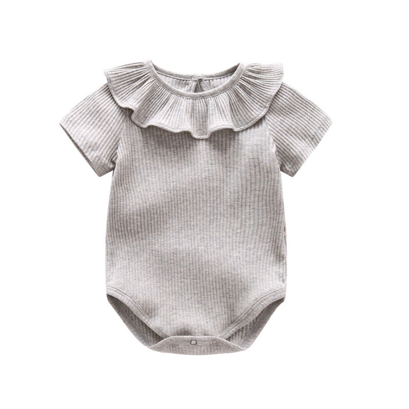 It has a ruffled collar and short sleeves. It has three snaps at the bottom for easy diaper changes.